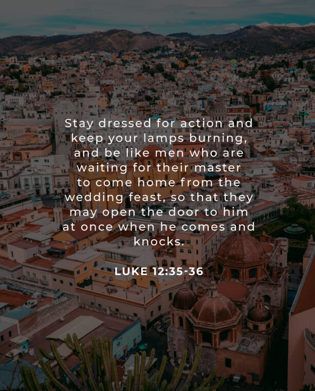 A key part of competitive athletics is training. A runner would never show up to a race without months of training beforehand. Without preparation, injury will occur. Similarly, we must be prepared for when our Jesus returns. Luke places an emphasis on the vitality of time. When he says to stay dressed for action and keep our lamps burning, it means that he wants us to always be ready for the Lord. In ancient times the people wore a long, loose robe as an outer garment, making it impossible to run or work. To be ready for action, they would gird up or tie it up to help them to move easily. We also ought to be like men who are waiting for their master to come home from the wedding feast. In those days a wedding would go on for many days, and the servant wouldn’t know when his master would return. He had to be ready at all times to open the door for the master. While waiting for our Master, we ought to build our faith by keeping our eyes fixed on Him. Being ready does not mean waiting without doing anything — it means to wait with a twinkle in the eye with the expectation He will return.