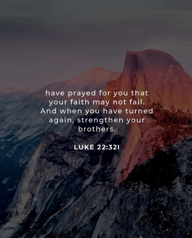 I find this a truly comforting caution and command. This verse tells us how much Jesus knows us and cares for us. The first thing that becomes clear from this verse is that no one is exempt from failure. We see later in the chapter how Peter learned this difficult lesson. The apostle Paul warns, “Therefore let anyone who thinks that he stands take heed lest he fall” (1 Cor. 10:12). Jesus knew Peter was not yet on firm ground! It is so comforting to know that Jesus knew what was going to happen in Peter’s life, and He had already interceded for Him so Peter would not be lost. Peter denied Jesus three times, but he realized his mistake and turned back to Him. In keeping with Jesus’ instruction to him, Peter becomes the rock on which the church is built, strengthening his brethren wherever he went. I like the certainty with which Jesus tells Peter “and when you have turned back,” not “and if you turn back.” Jesus knew Peter would not be lost. It’s the same in our lives. Jesus knows our every weakness, and He plans ahead and prays for us to stay strong.